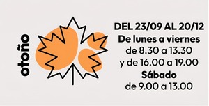 Otoño (Del 23 de Septiembre al 20 de Diciembre): De lunes a viernes: de 8,30 h. a 13,30 h. y de 16:00 h. a 19,00 h. Sábados de 9:00 h. a 13:00 h.